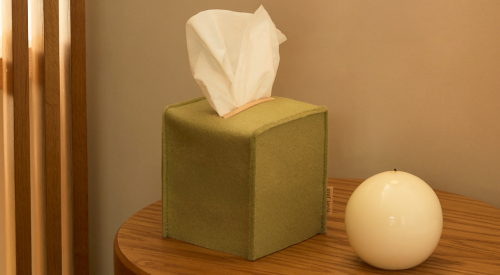 A sustainable beige felt tissue box cover by graf lantz, made from Merino wool, showcases a single white tissue gracefully emerging from the top on a light gray background.