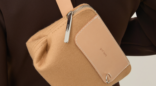 A person wears a beige sweater of soft merino wool and clutches a small graf lantz bag with a gray body and tan flap, exuding cozy elegance against a light background while hinting at hands-free convenience.