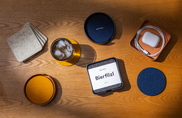 Displayed alongside a light wooden holder, the graf lantz Bierfilzl set consists of colorful Merino wool coasters. Stacked neatly in hues of red, blue, and green, they blend style with eco-conscious living and are crafted from sustainable materials.